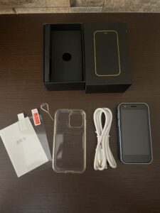 開封すると、ミニフォン本体に保護シート、クリアケース(ソフト)、C-TYPEケーブル、SiMピン、取扱説明書が同封されています。